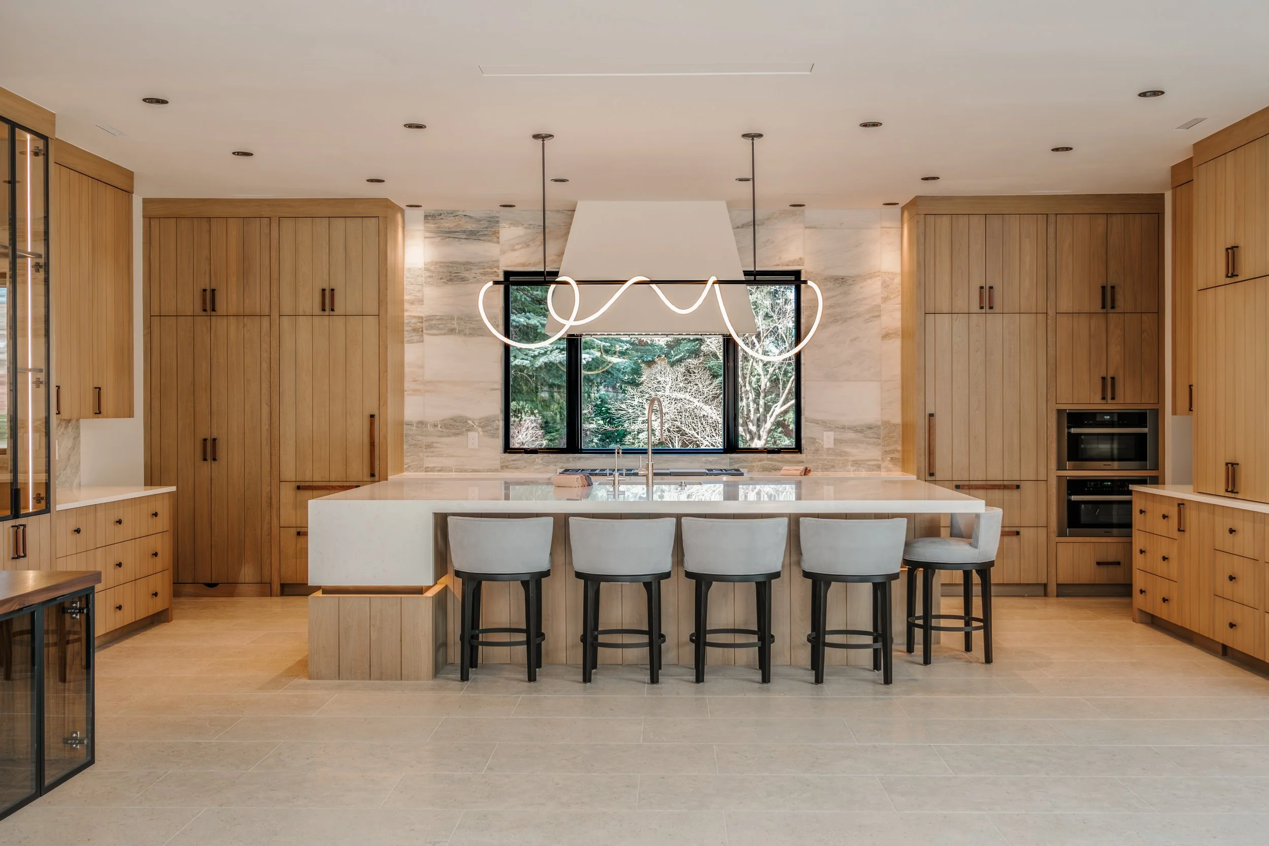 The chef’s kitchen is both functional and sculptural, appointed with limestone flooring, quartzite countertops, marble backsplash, top-of-the-line appliances, and a separate butler’s pantry. Adjacent living and dining spaces are thoughtfully composed for both intimate daily living and elevated entertaining.